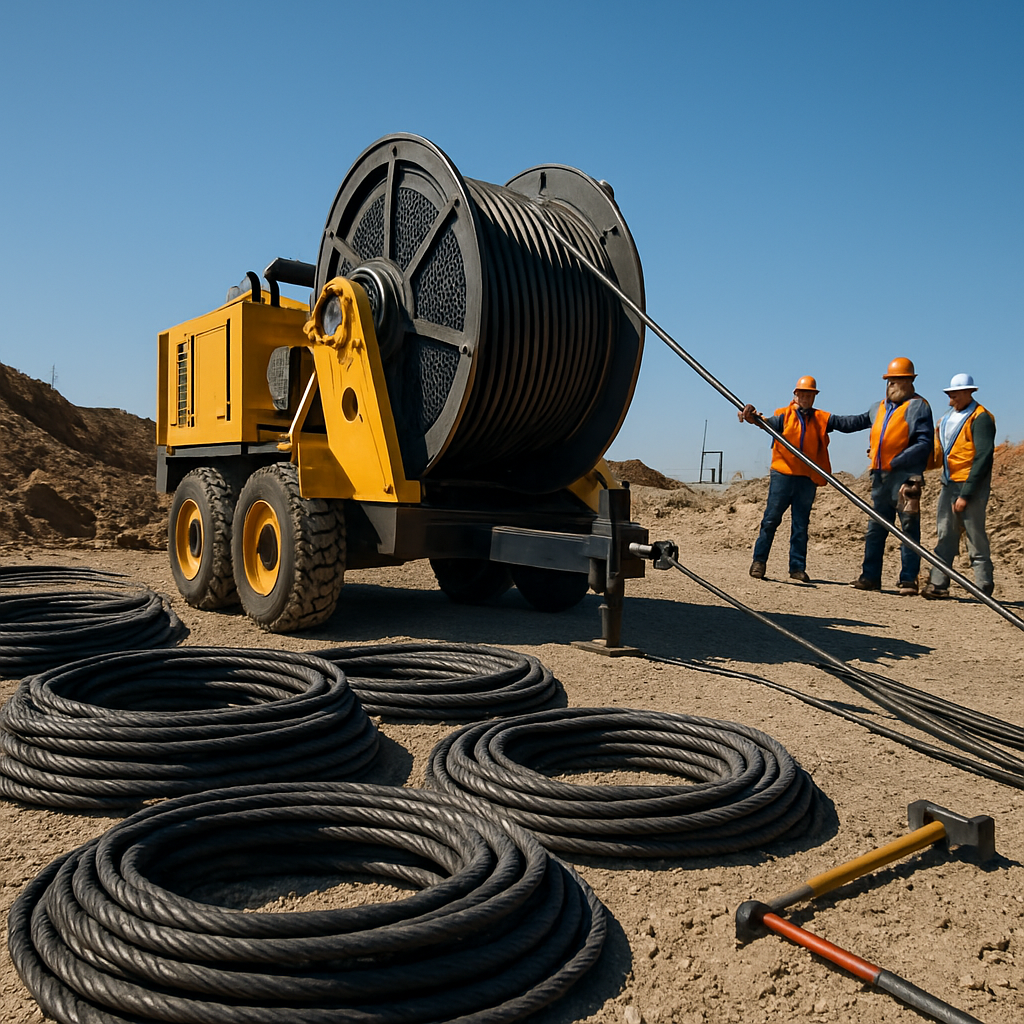 - Power distribution: LV/MV feeders in streets, subdivision reticulation, and HV feeders between substations. Cables are bulky and heavy, so winch-assisted pulls and careful tension control are critical.